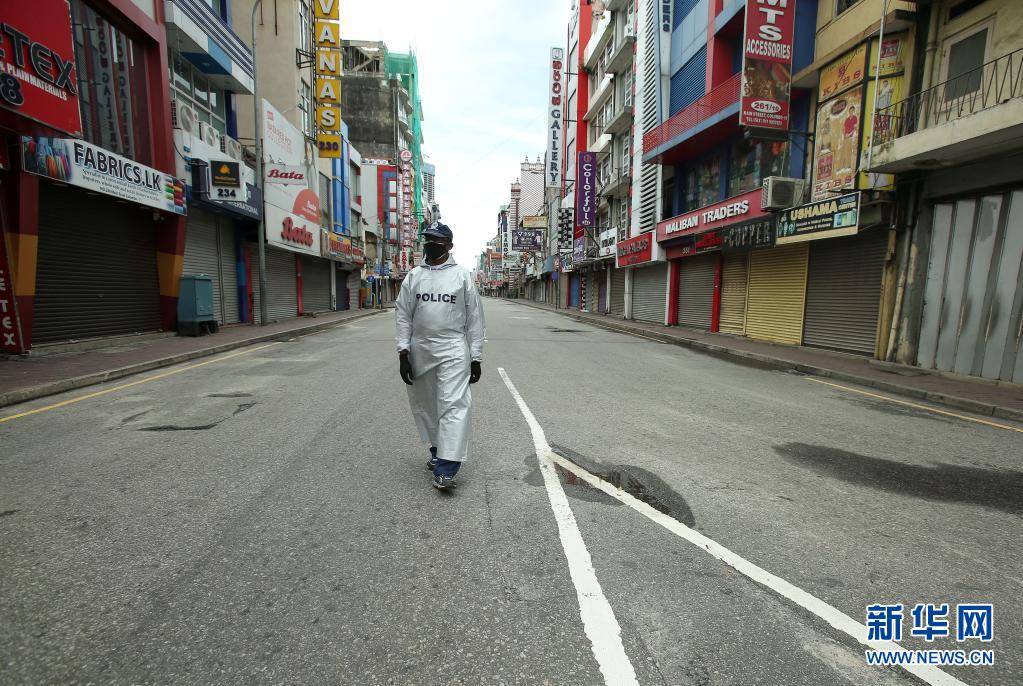 5月14日,警察在斯里兰卡科伦坡一条空旷的商业街上执勤。
