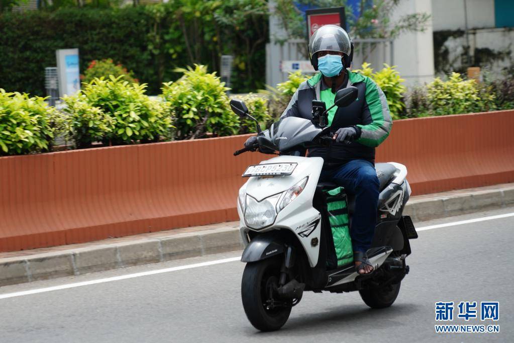 5月14日,外卖送餐员在斯里兰卡科伦坡街头骑行。