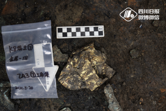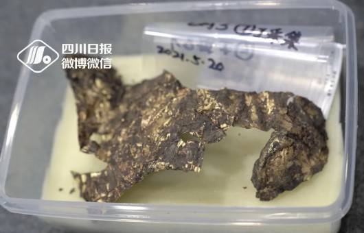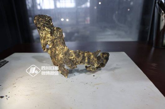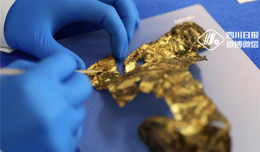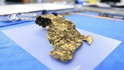 “这是我们刚刚提取的一个金面具残片,能够很清晰地看到它的眼睛和嘴巴,它应该是一个相对来说比较完整的金面具,这也是我们8号坑目前发现的最大的一个金面具残片,”8号坑坑长、北京大学考古文博学院博士后蔡宁介绍。
