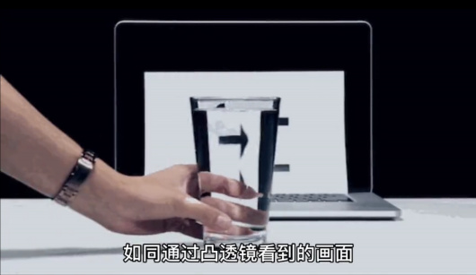 水杯就像是凸透镜一样,水杯经过时,如同通过凸透镜看到的画面,此时形成的像便是相反的、倒立的,自然箭头也就反过来了。