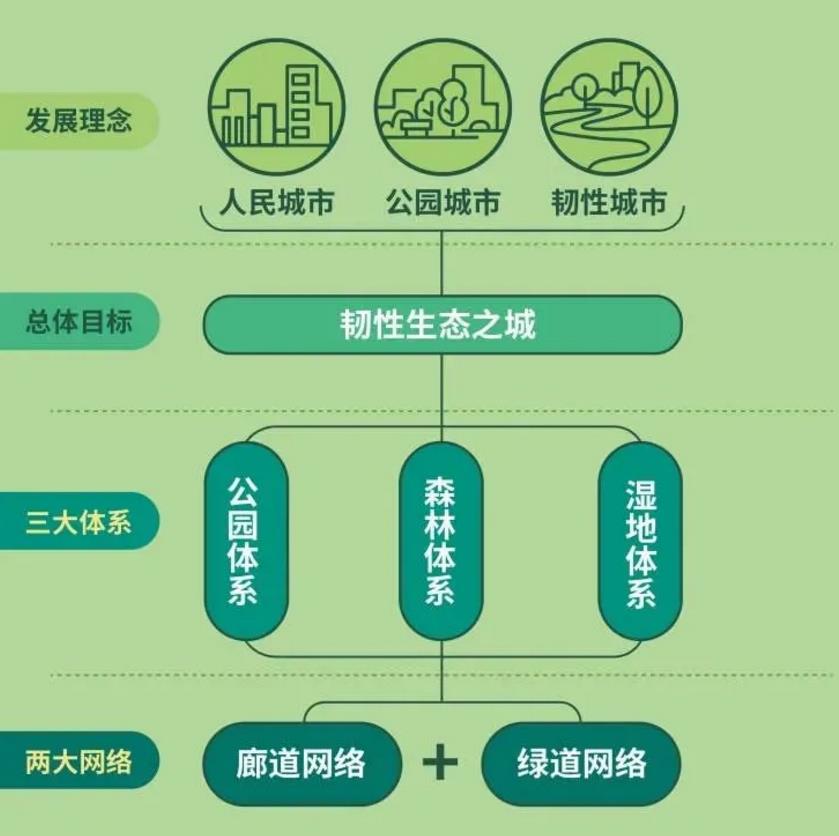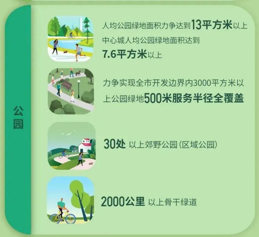 “园中建城,城中有园,城园相融,人城和谐”,规划提出以国家公园、郊野公园(区域公园)、城市公园、地区公园、社区公园、微型(口袋)公园为主体,立体绿化为补充,建设多层次城乡公园体系,营造多元化市民休闲游憩空间,力争实现中心城人均公园绿地面积达到7.6平方米以上。