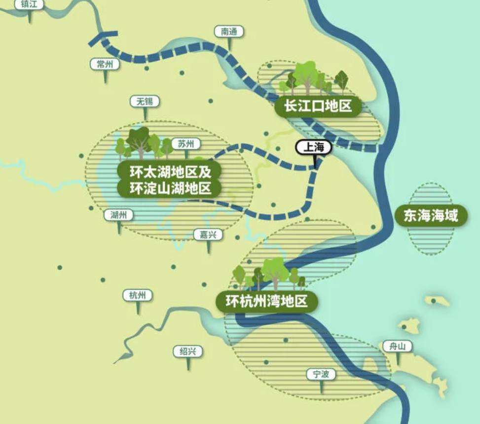 规划提出,要共同完善长江口、东海海域、环太湖、环淀山湖、环杭州湾等生态区域的保护,整体提升区域生态环境品质。预留嘉宝-沿长江、吴淞江、黄浦江及其上游(含淀山湖)、沿杭州湾四个重要的生态接口,加快构建区域性生态空间网络。