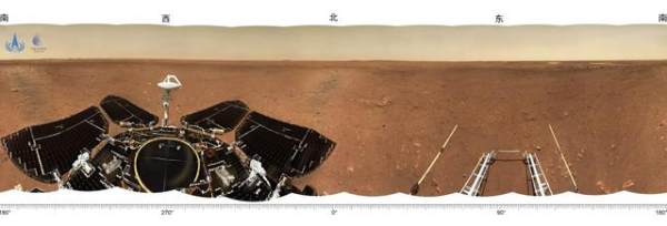 着陆点全景图,是火星车尚未驶离着陆平台时,由火星车桅杆上的导航地形相机,进行360°环拍,经过校正和镶嵌拼接而成。图像显示,着陆点附近地势平坦,远处可见火星地平线,石块丰度和尺寸与预期一致,表明着陆点自主选择和悬停避障实施效果良好。