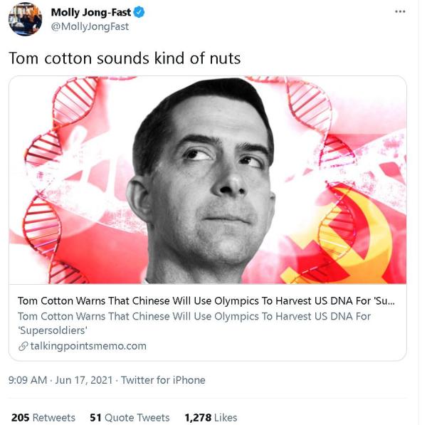 有人还联想到了今年马上就要开幕的东京奥运会:汤姆·科顿难道不担心今年的日本奥运会上出现他所说的搜集DNA的事情吗?
