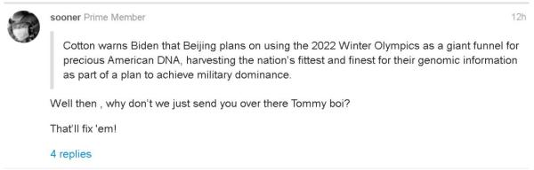 根据美国《国会山报》和美国共和党右翼势力的“喉舌”福克斯新闻网的报道,科顿在一封写给拜登的信中宣称,在2022年北京冬奥会期间,来自美国和世界各地的优秀运动员都会前往中国,进而令中国政府拥有“收集”他们DNA,用来研究“超级士兵”。
