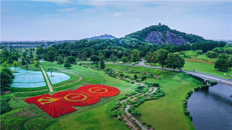 位于三号门旁的花海区域,新建《百年华诞》主题花坛以“中国共产党成立100周年庆祝活动标识”为蓝本,选用一串红铺就标识的红色基底,其中的党徽与数字“100”、“1921”、“2021”使用黄色孔雀草来填充,而代表56个民族大团结的56根金色光芒线则用橙色孔雀草勾勒而出,同时采用地肤和应季草花营造花坛背景,整个花坛气势恢弘。
