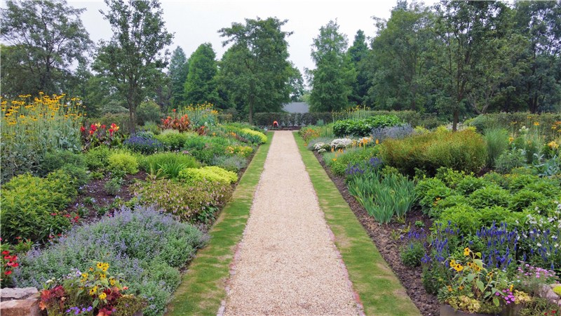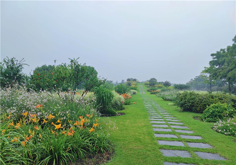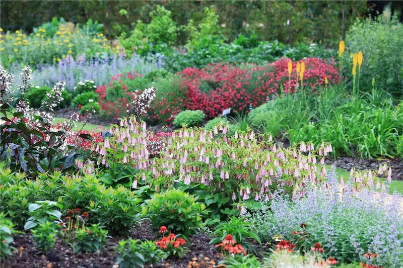 由夏季经典植物打造的琴键花境景观,花境在红色花卉的基础上增添多种色彩。在此,整个游线进入尾声。