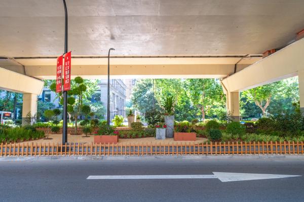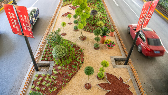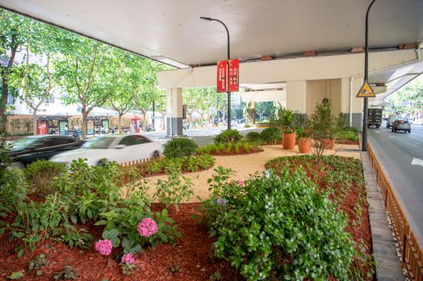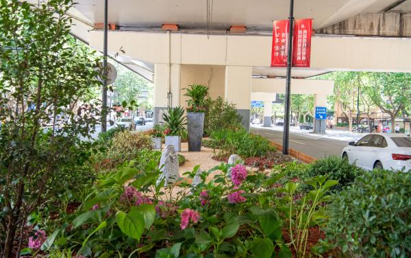 本次环境整治总面积约7700平方米,通过将原来硬质地坪转变为景观绿地,辅以景观小品及覆盖物的巧妙运用,将自然山水的理念引入城市,使原本阴暗的高架桥下环境提亮增色,让市民在出行过程中感受到城市的生机,展现高架桥孔的别样风采。