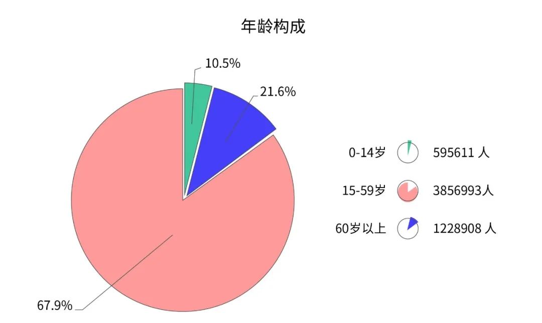 全区常住人口中,0-14岁人口为595611人,占10.5%;15-59岁人口为3856993人,占67.9%;60岁及以上人口为1228908人,占21.6%,其中65岁及以上人口为851457人,占15.0%。