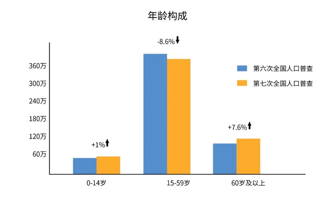 与2010年第六次全国人口普查相比,0-14岁人口的比重提高1个百分点,15-59岁人口的比重下降8.6个百分点,60岁及以上人口的比重提高7.6个百分点,65岁及以上人口的比重提高5.8个百分点。