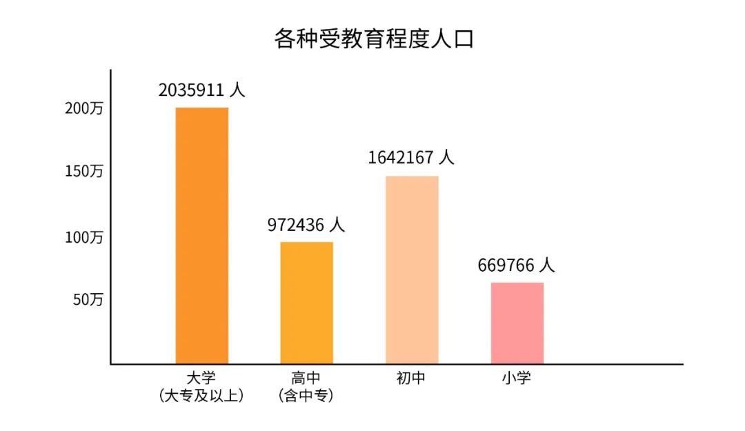 全区常住人口中,拥有大学(指大专及以上)文化程度的人口为2035911人;拥有高中(含中专)文化程度的人口为972436人;拥有初中文化程度的人口为1642167人;拥有小学文化程度的人口为669766人(以上各种受教育程度的人包括各类学校的毕业生、肄业生和在校生)。