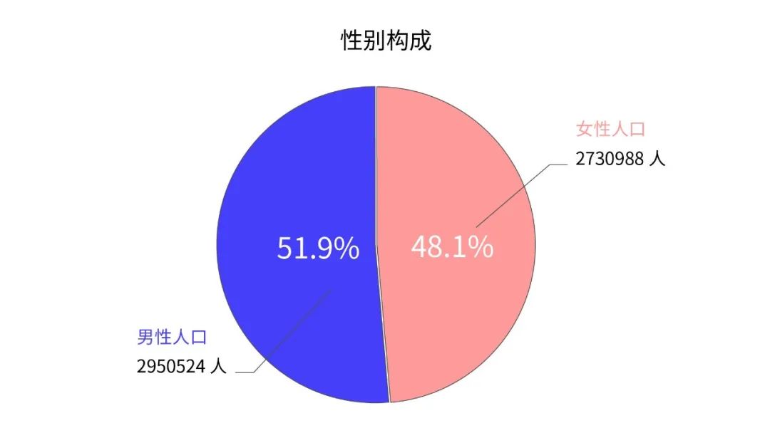 全区常住人口中,男性人口为2950524人,占51.9%;女性人口为2730988人,占48.1%。
