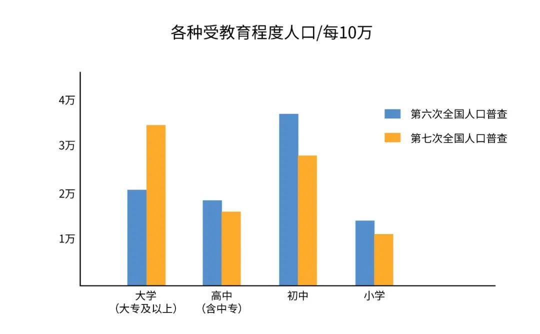 与2010年第六次全国人口普查相比,每10万人中拥有大学文化程度的由21895人上升为35834人;拥有高中文化程度的由19011人下降为17116人;拥有初中文化程度的由37617人下降为28904人;拥有小学文化程度的由13929人下降为11789人。