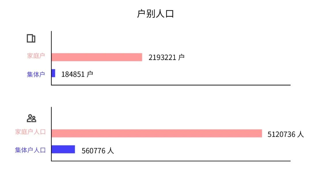 全区常住人口中,共有家庭户2193221户,集体户184851户,家庭户人口为5120736人,集体户人口为560776人。