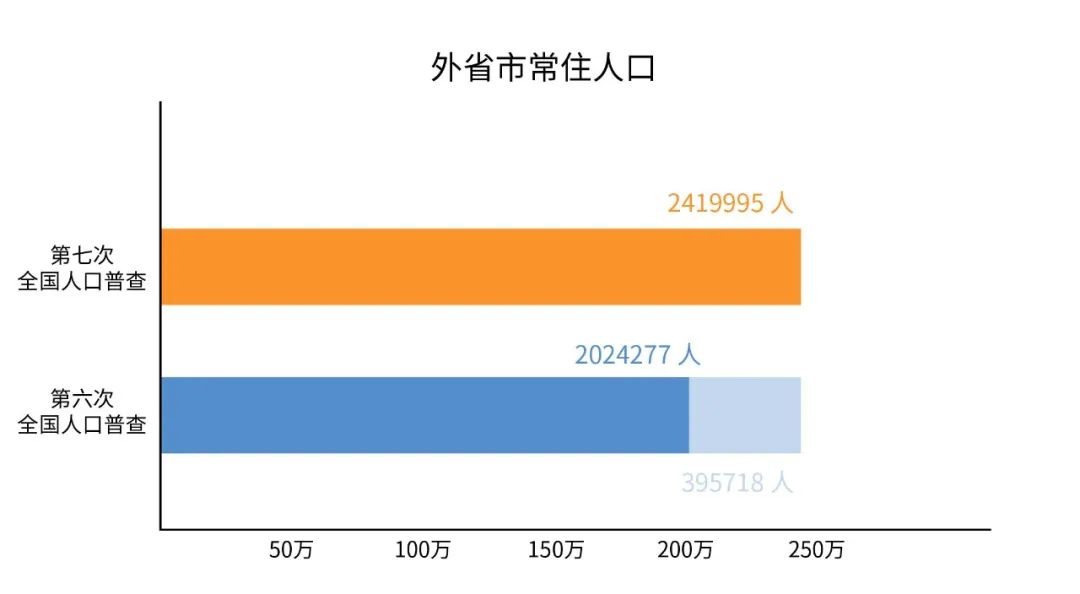 全区常住人口中,外省市来浦东新区常住人口为2419995人,占比42.6%,同第六次全国人口普查的2024277人相比,十年共增加395718人,增长19.5%。平均每年增加39572人,年平均增长率为1.8%。