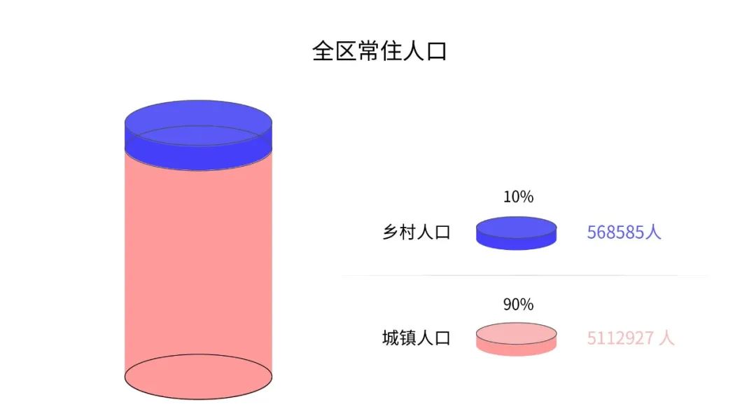 全区常住人口中,居住在城镇的人口为5112927人,占90.0%;居住在乡村的人口为568585人,占10.0%。