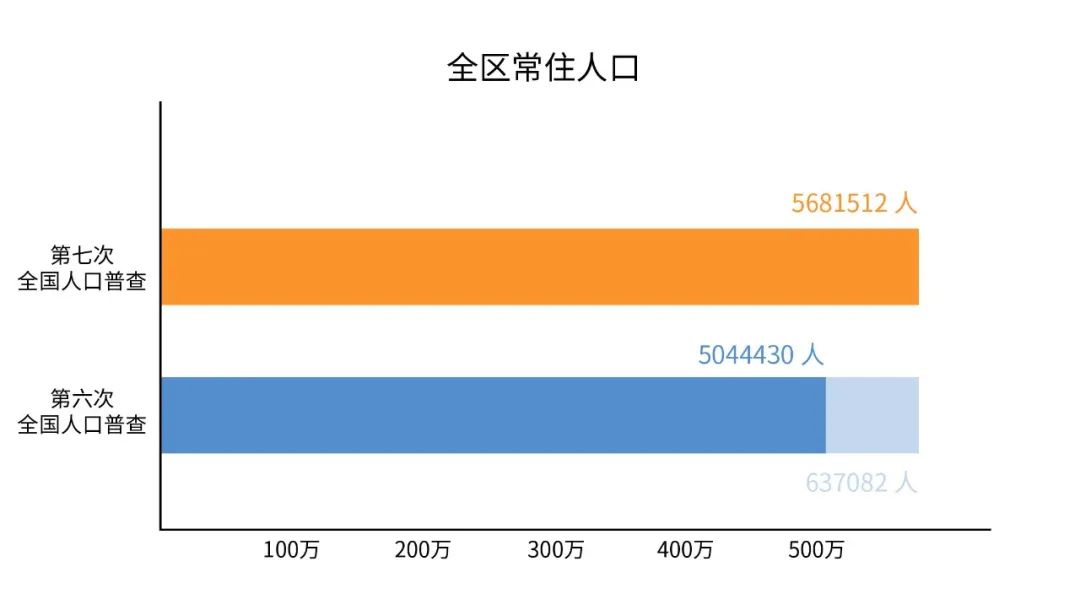 全区常住人口为5681512人,同第六次全国人口普查的5044430人相比,十年共增加637082人,增长12.6%,平均每年增加63708人,年平均增长率为1.2%。