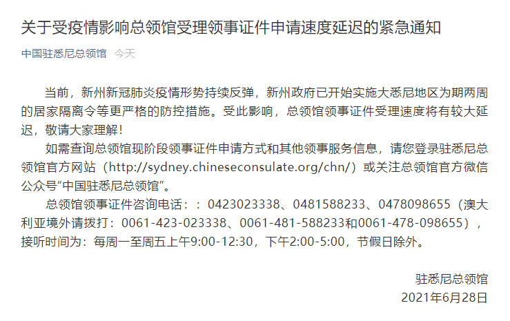 据中国驻悉尼总领馆官方微信消息,当前,新州新冠肺炎疫情形势持续反弹,新州政府已开始实施大悉尼地区为期两周的居家隔离令等更严格的防控措施。受此影响,总领馆领事证件受理速度将有较大延迟,敬请大家理解!