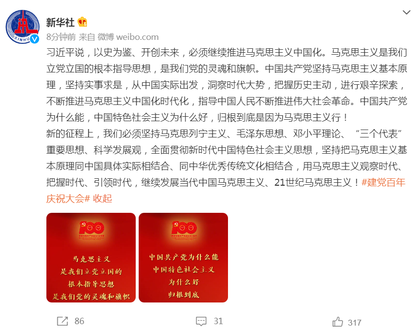 习近平说,以史为鉴、开创未来,必须继续推进马克思主义中国化。马克思主义是我们立党立国的根本指导思想,是我们党的灵魂和旗帜。中国共产党坚持马克思主义基本原理,坚持实事求是,从中国实际出发,洞察时代大势,把握历史主动,进行艰辛探索,不断推进马克思主义中国化时代化,指导中国人民不断推进伟大社会革命。中国共产党为什么能,中国特色社会主义为什么好,归根到底是因为马克思主义行!