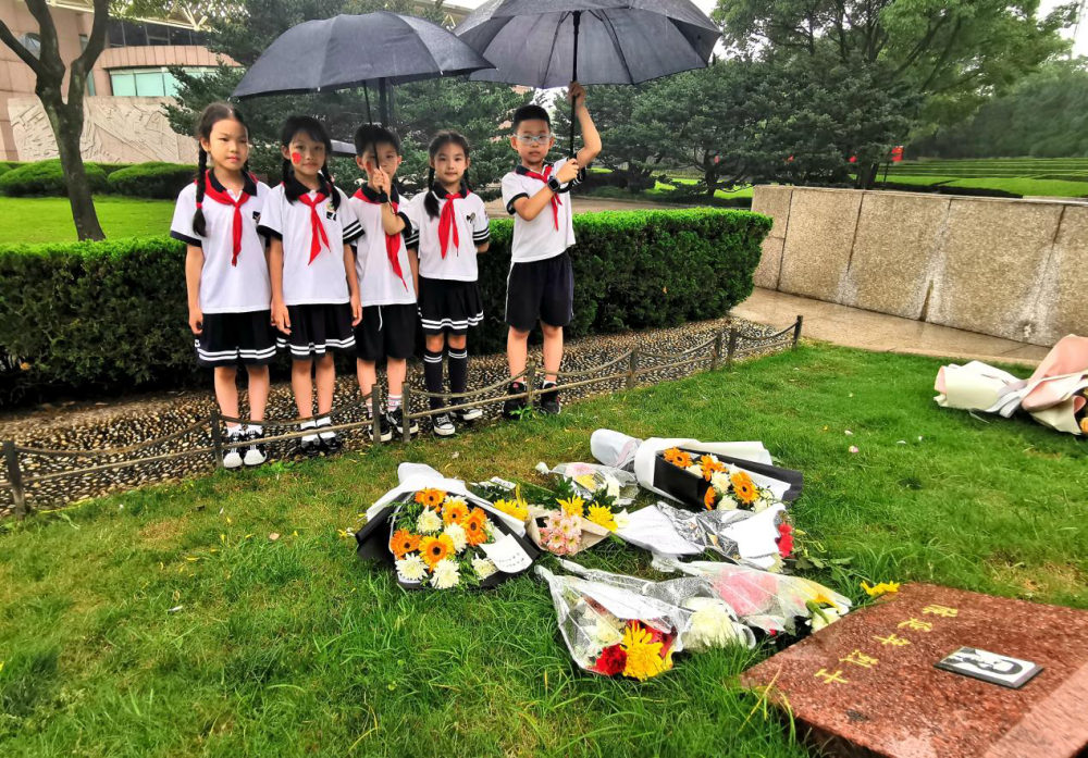 7月2日,5名少先队员冒雨来到上海龙华烈士陵园陈延年烈士墓前追思,致敬先烈。新华网罗沛鹏 摄