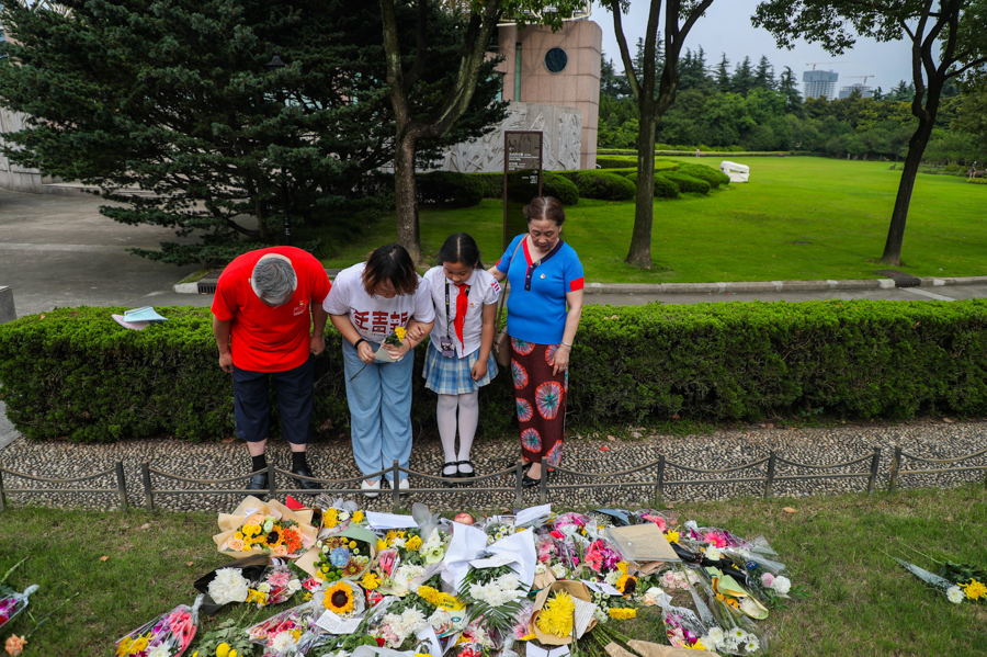 7月1日,身着“新青年”字样上衣的曾女士携祖孙三代来到上海龙华烈士陵园,致敬陈延年、陈乔年、赵世炎三位烈士。新华网吴恺 摄