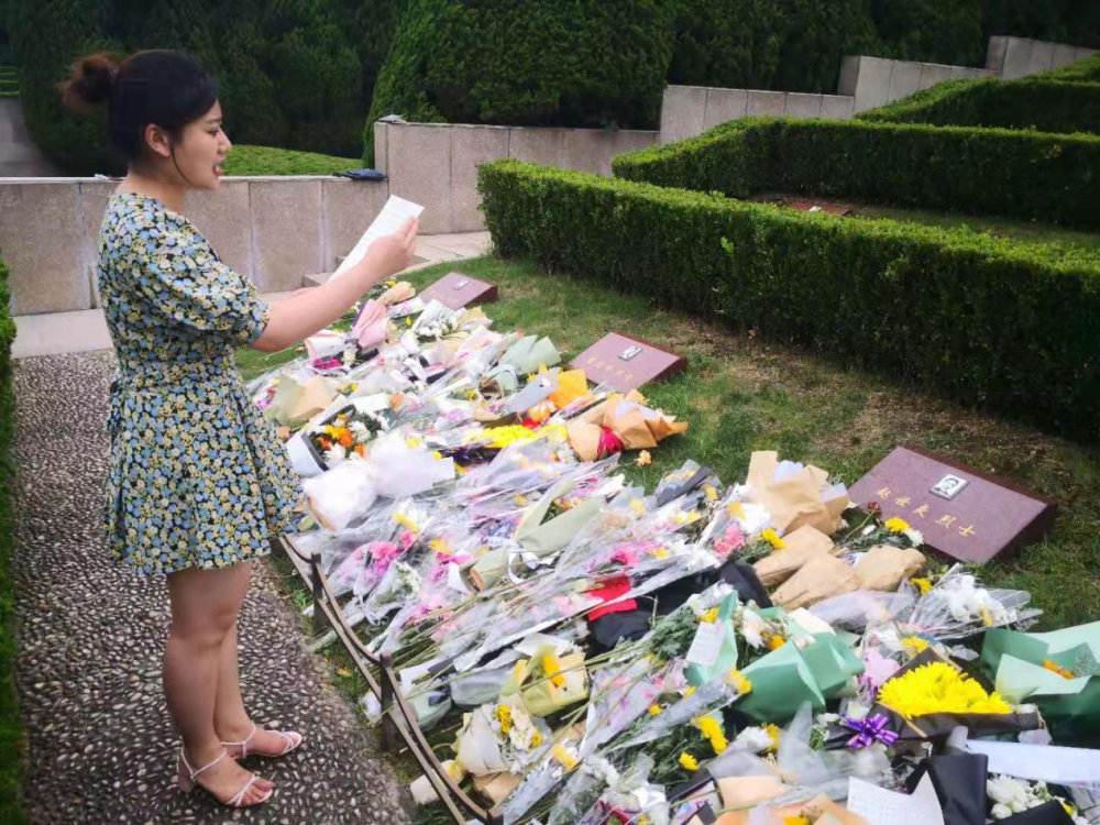 7月1日,王女士从苏州赶到上海龙华烈士陵园,向陈延年烈士朗读书信寄托哀思。新华网吴恺 摄