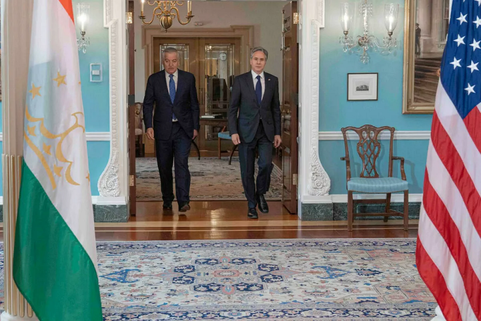 ▲ 美国国务卿布林肯(右)与塔吉克斯坦外长穆赫里丁在华盛顿会谈。