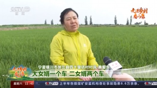 宁夏银川市贺兰县四十里店村村民 黄爱东:老公一个车,女婿两个车,大女婿一个车,二女婿两个车。日子肯定比(过去)好多了。那个时候想都不敢想,哪能买车呢?连个手扶(拖拉机)都买不起。