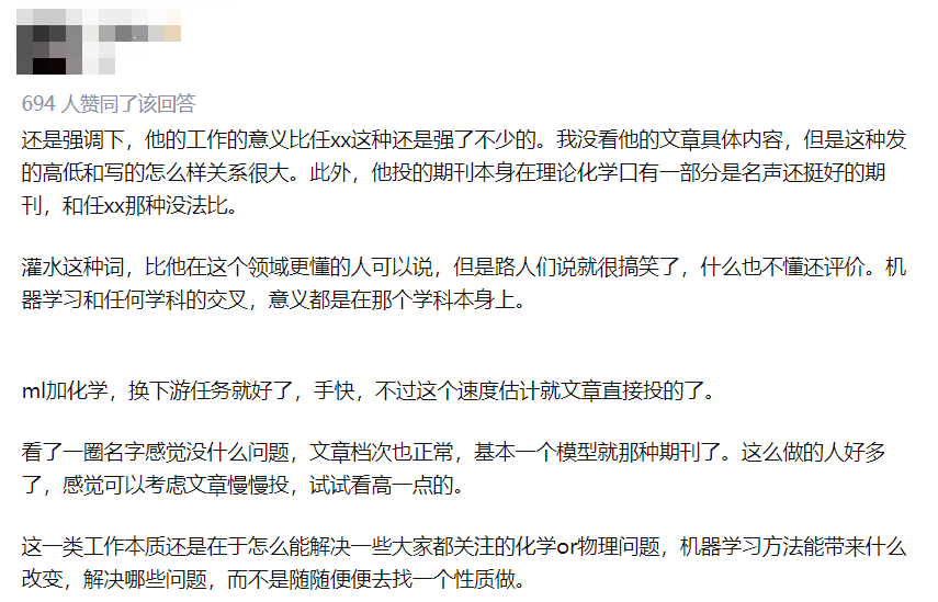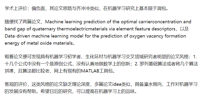 万仲禹的工作就真的是在灌水了吗?知乎网友@马扁龙认为,万仲禹所发的期刊有一定的权威性和知名度,而且科研工作的意义更应该由内行人来发声。对有人可能质疑万仲禹在蹭机器学习的热度,@马扁龙认为,”机器学习和任何学科的交叉,意义都是在那个学科本身上……这一类工作本质还是在于怎么能解决一些大家都关注的化学or物理问题,机器学习方法能带来什么改变,解决哪些问题。“