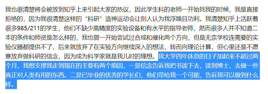 最后,万仲禹表示,“我亲自来写这个回答,也希望成千上万的二本学生看到,我们没有985/211的条件,但不代表二本的学生没有梦想,没有权利去追求科学的真理。”