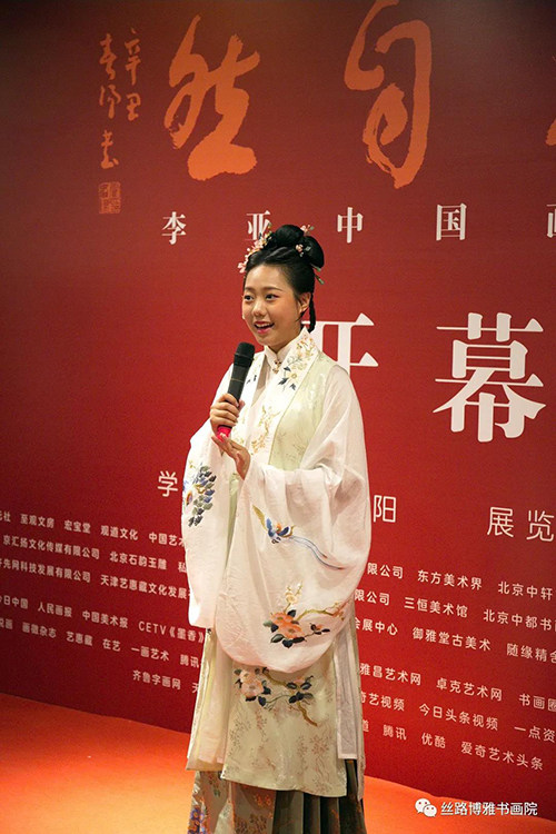 李亚先生爱女、中国戏曲学院表演系昆曲专业李昊昱演唱昆曲《咏花》,还以汉服模特走秀的方式展示了李亚画的团扇和折扇为展览共同助力。