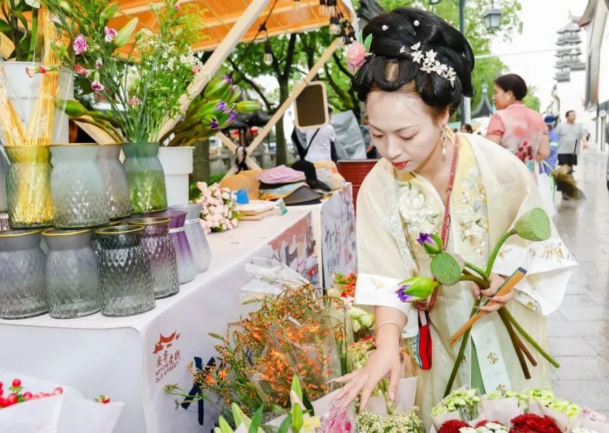 市集分为“趣味江南”“吃货江南”“美物江南”三个区域。沿着严泗桥、永安塔、菩提寺一路游玩,既有文物古迹,也有潮玩文创。大学生沐雪得知安亭老街正举办市集,立刻约上好友,穿着汉服来逛逛。“东西好吃,文创也很精美。”沐雪说,穿汉服更能融入老街的氛围,特别适合拍照。