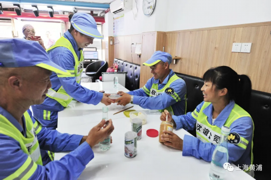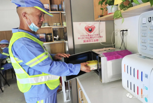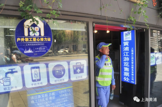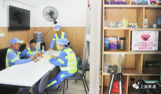 临近中午时分,赵俊领和班里的同事们也可以暂时歇一歇了,大家走进了外滩观景平台下的一家外滩旅游服务的“浦江游览售票点”,这里也是一个“户外职工爱心接力站”,环卫工人在这里也能喝口水、小憩片刻,安装着空调的空间不仅环境舒适,而且有电扇、冰箱、微波炉等设施,热个饭吃午餐都十分方便,这里的工作人员热情欢迎广大户外劳动者来休息小憩,让他们能够享受一份清凉。