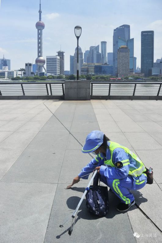 上午10点左右,负责外滩清水平台保洁的赵俊领系上她的保洁“八件套”,照样在晒得滚烫的大理石平台上进行日常保洁,发现地面上的口香糖块结成了硬块,就弯下腰一点一点地铲除干净。