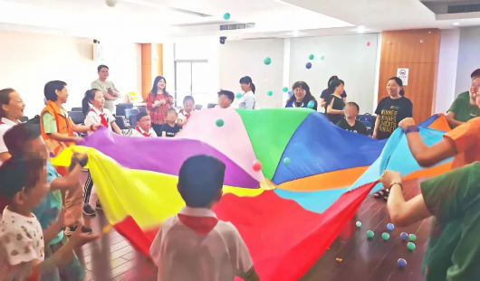 小朋友们都积极投入“彩虹伞”游戏中,活动现场气氛活跃、高潮迭起、精彩纷呈。家长和志愿者被小朋友们欢乐的笑声所感染,也纷纷加入进来围成同心圆,用行动呵护小朋友的成长。