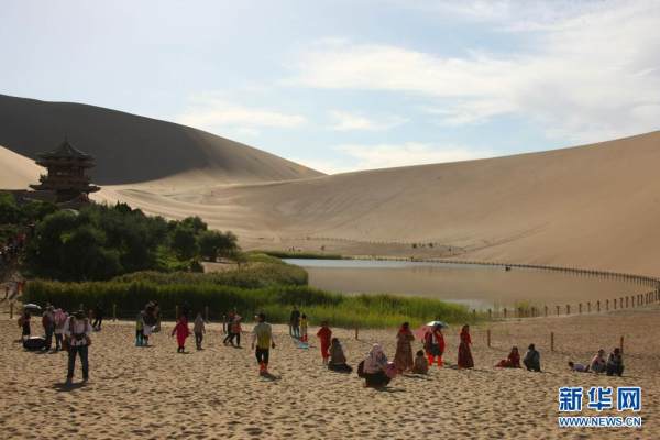 7月5日,游客在敦煌月牙泉游玩。新华社记者 刘诗平 摄