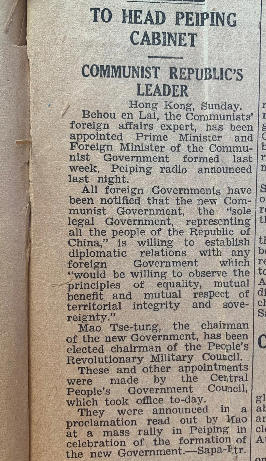 △1949年10月3日,《先驱报》报道了中华人民共和国成立,中国政府愿在平等、互利和互相尊重领土主权等原则基础上同各国建立外交关系。