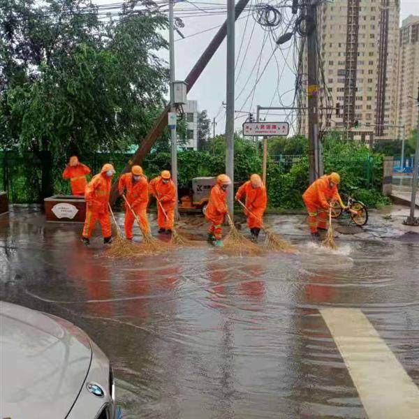 城市管理办公室组织保洁单位积极开展雨中保洁工作,重点对淤积落叶、污泥等杂物造成的积水路段进行人工疏通,防止排水管网堵塞。同时,保洁单位根据路段积水情况,及时组织工人进行推水作业,确保居民安全出行。