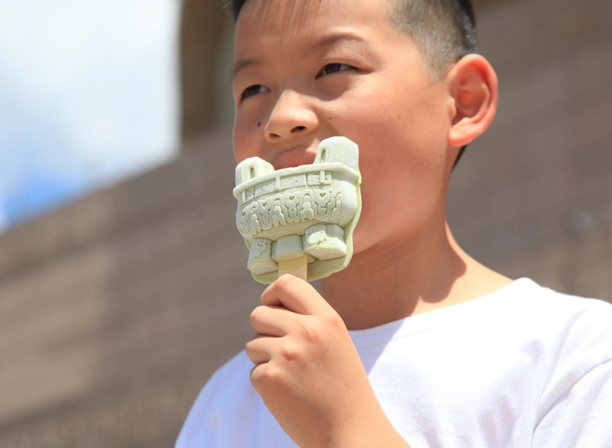 2021年7月21日,上海市,一个小朋友在上海博物馆前吃故宫购买的大克鼎雪糕。