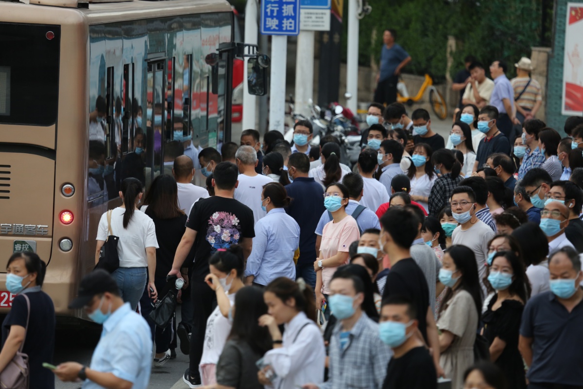 2021年7月29日,河南省郑州市,郑州遭遇特大暴雨致地铁停运,市区多条路段塌陷受到交通管制。当日,在紫荆山公交车站早高峰时段,上班族一波接一波蜂拥乘车。据悉,为有效缓解交通压力,减少车辆拥堵,鼓励广大市民乘坐公共交通工具出行,郑州市政府决定,自7月28日起至8月28日止,凡乘坐郑州公交的乘客全部免费。截至7月28日8:00,郑州公交已恢复运营339条,线路恢复率100%。全线恢复运营线路284条。图为上班早高峰等公交乘车的人员。