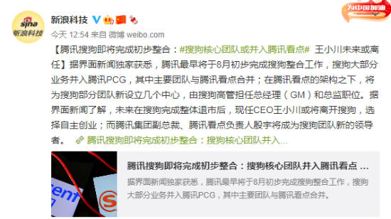 新浪科技报道,据界面新闻独家获悉,腾讯搜狗即将完成初步整合;搜狗核心团队或并入腾讯看点;王小川未来或离任。