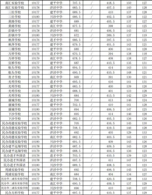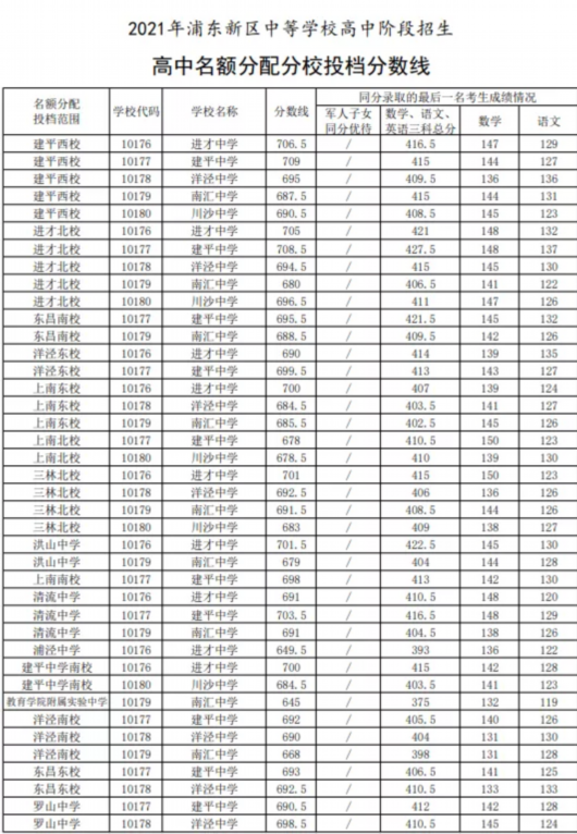 2021年上海市中等学校高中阶段招生(崇明区)名额分配投档分数线
