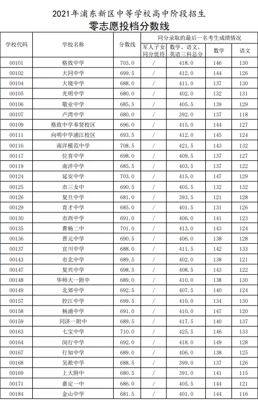 2021年上海市中等学校高中阶段招生(崇明区)零志愿投档分数线