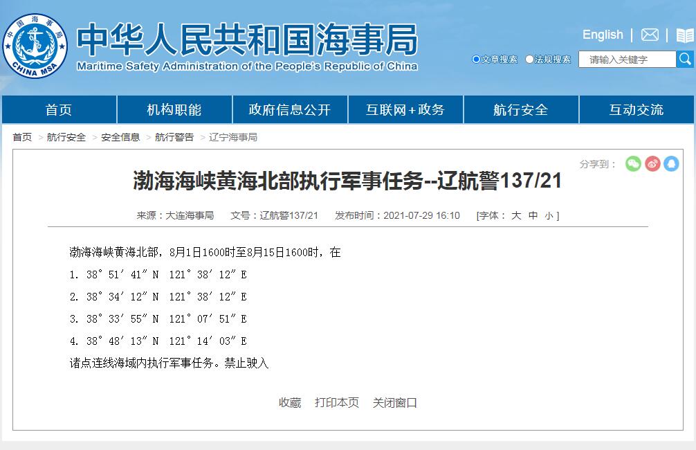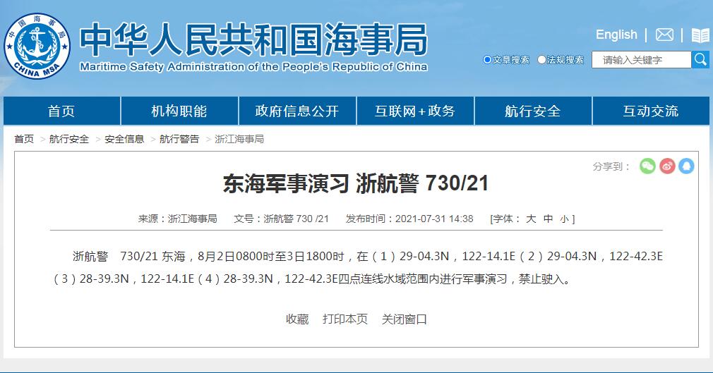 资料图:浙江海事局和大连海事局发布的航行警告 来源:中国海事局网站截图