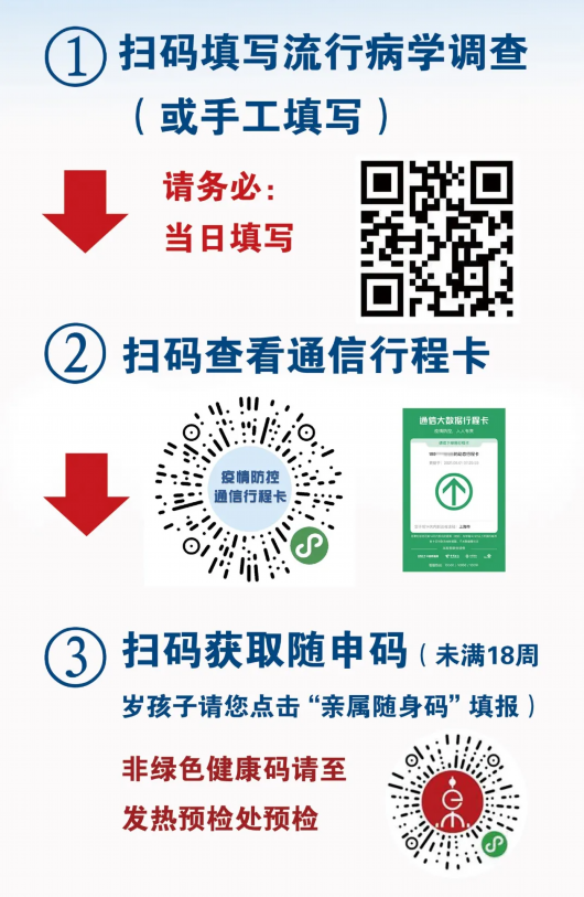 3、体温异常(≥37.3℃)或有明显呼吸道症状的人员,14天内来自或途经国内疫情中、高风险地区的来沪人员,健康码、行程卡为黄色或红色的人员请直接至发热门诊就诊。