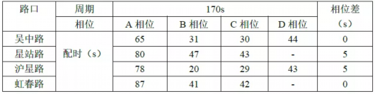 (2)考虑七莘/吴中路口北进口、七莘/沪星路口南进口增加(直行+左转)单放相位,减少车辆停留积压,避免路口溢出;
