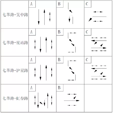 针对七莘/吴中路口北进口直行+左转放行时长不足的问题,在保证其它几个进口通行秩序和通行效率的条件下,对北进口增设(直行+左转)单放的搭接相位;七莘/沪星路口南进口增设(直行+左转)单放的搭接相位。