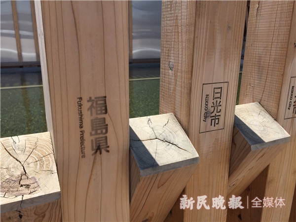 仔细看,会发现每根木头上都标有来处,如栃木县、日光市、千叶县,是日本各地贡献的木料。他们排列组合在一起,构筑了奥运村一道特殊的风景线。