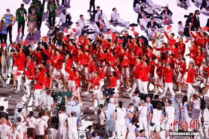 资料图:7月23日,第32届夏季奥林匹克运动会开幕式在日本东京新国立竞技场举行。图为中国体育代表团入场。 中新社记者 杜洋 摄