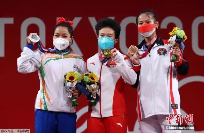 7月24日下午,东京奥运会女子49公斤级举重决赛在东京国际论坛大厦举行,中国举重名将侯志慧不负众望,以抓举94公斤,挺举116公斤,总成绩210公斤成功夺冠。图为颁奖仪式上,获得奖牌的选手一起合影。